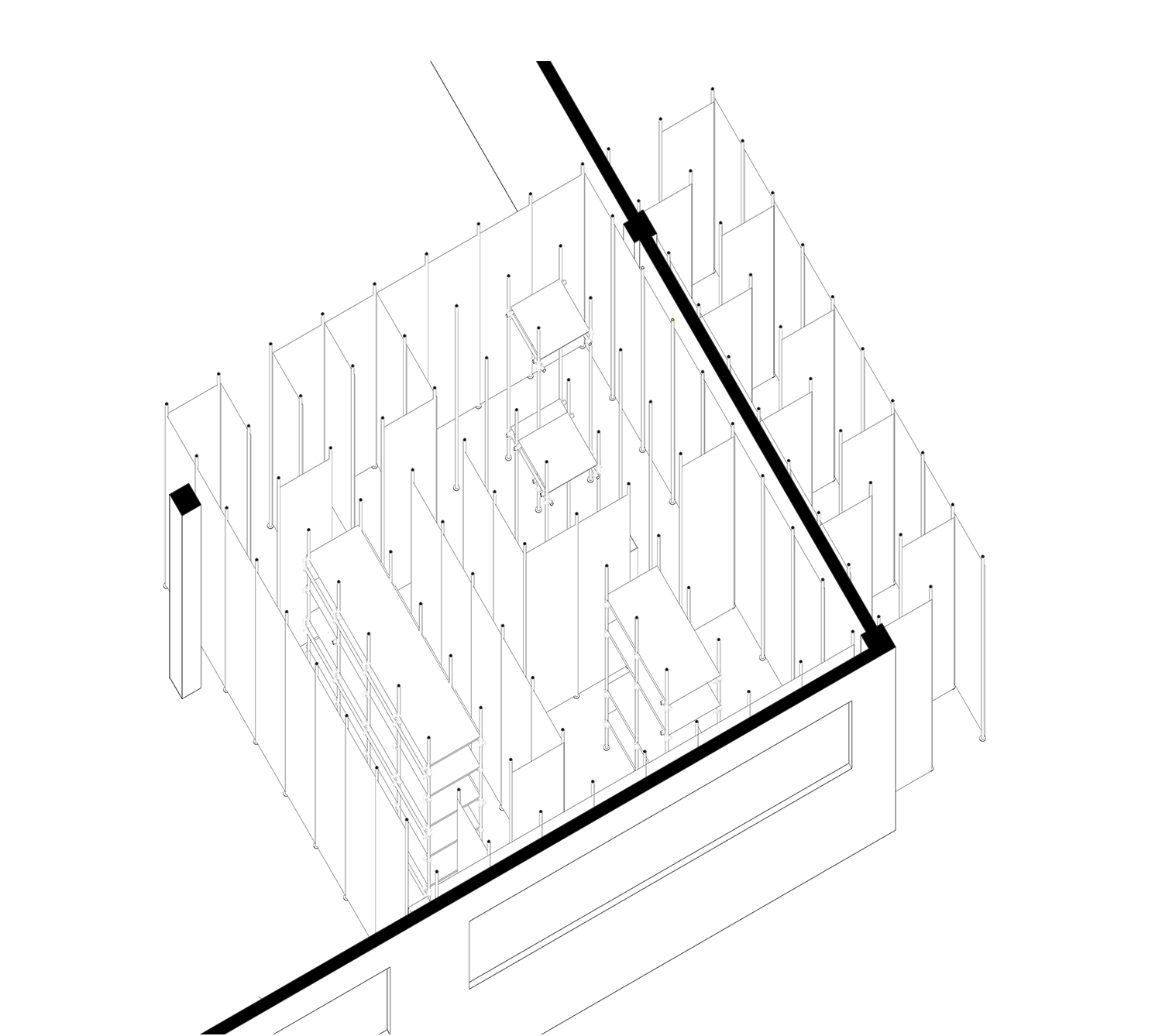 modular structure made of scaffolding pipes; the will is to guarantee a good reversibility of the structure (easy to assemble and disassemble), a significant reduction in costs compared to the use of metal profiles and a reduction in the