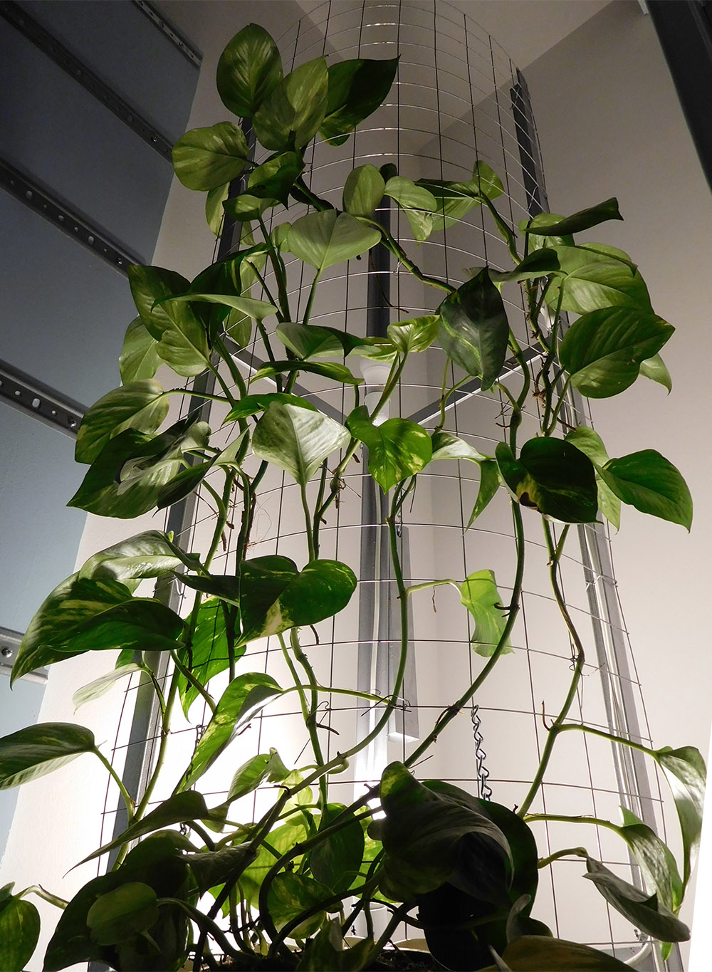 Una griglia a maglia quadrata sostiene dei vasi con delle rampicanti illuminate dall’interno da due portalampade.
