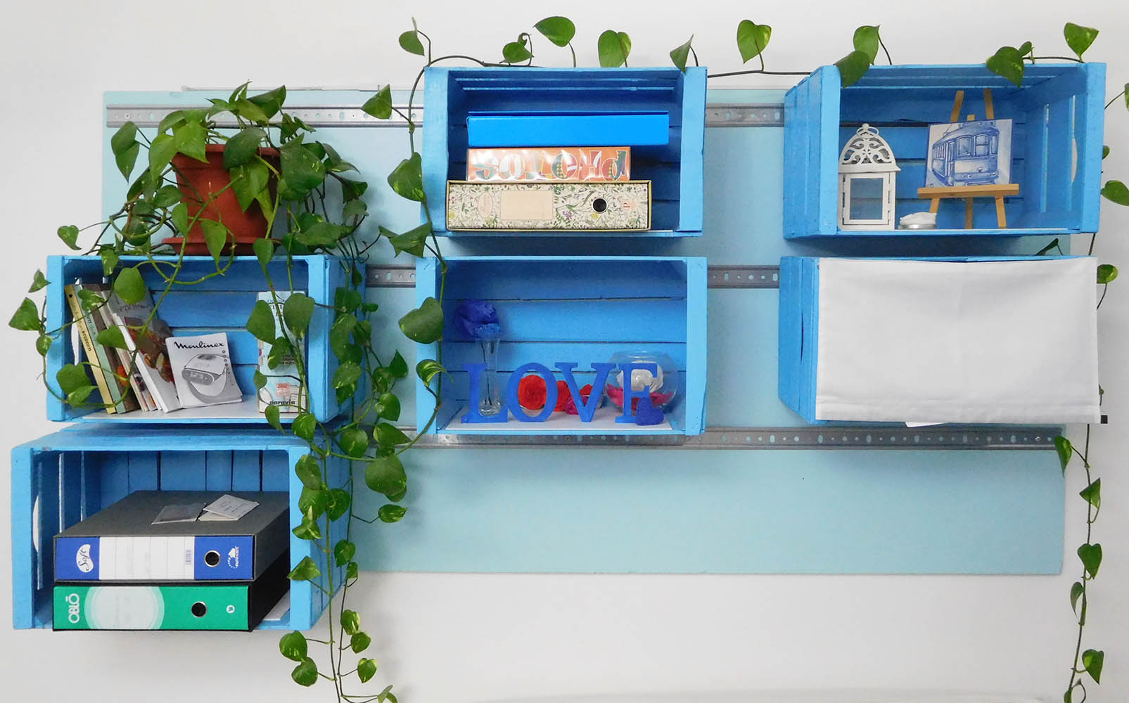 Il colore blu, voluto dalla committenza, connota l’arredamento artigianale mentre il colore bianco è usato da sfondo e per gli altri elementi. Tutto il progetto ruota intorno al tema della flessibilità: i mobili di cassette sono